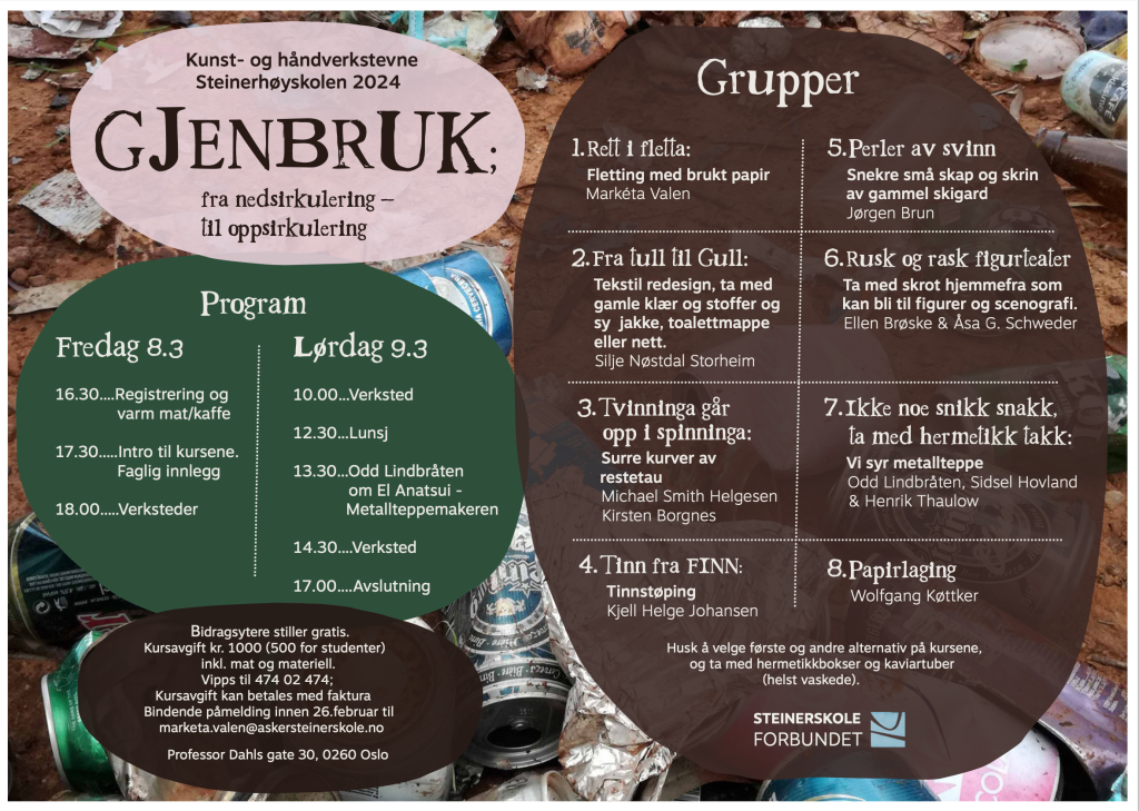 Har Steinerskolen en egen pedagogisk impuls? Finnes den også i kravet om gjenvinning? Har vi noe eget å vise hen på også her? Det er i hvert fall helt nødvendig å la alle våre handlinger ta hensyn til gjenvinning, redusere forbruket, redusere behovet for ting, ikke produsere noe som ikke blir tatt i bruk. Fremme bruken av materialer som har lang levetid. I årets Kunst- & Håndverksdager ønsker vi gjennom, verksteder, samtaler og foredrag å invitere til en dugnad omkring dette globale problem.
